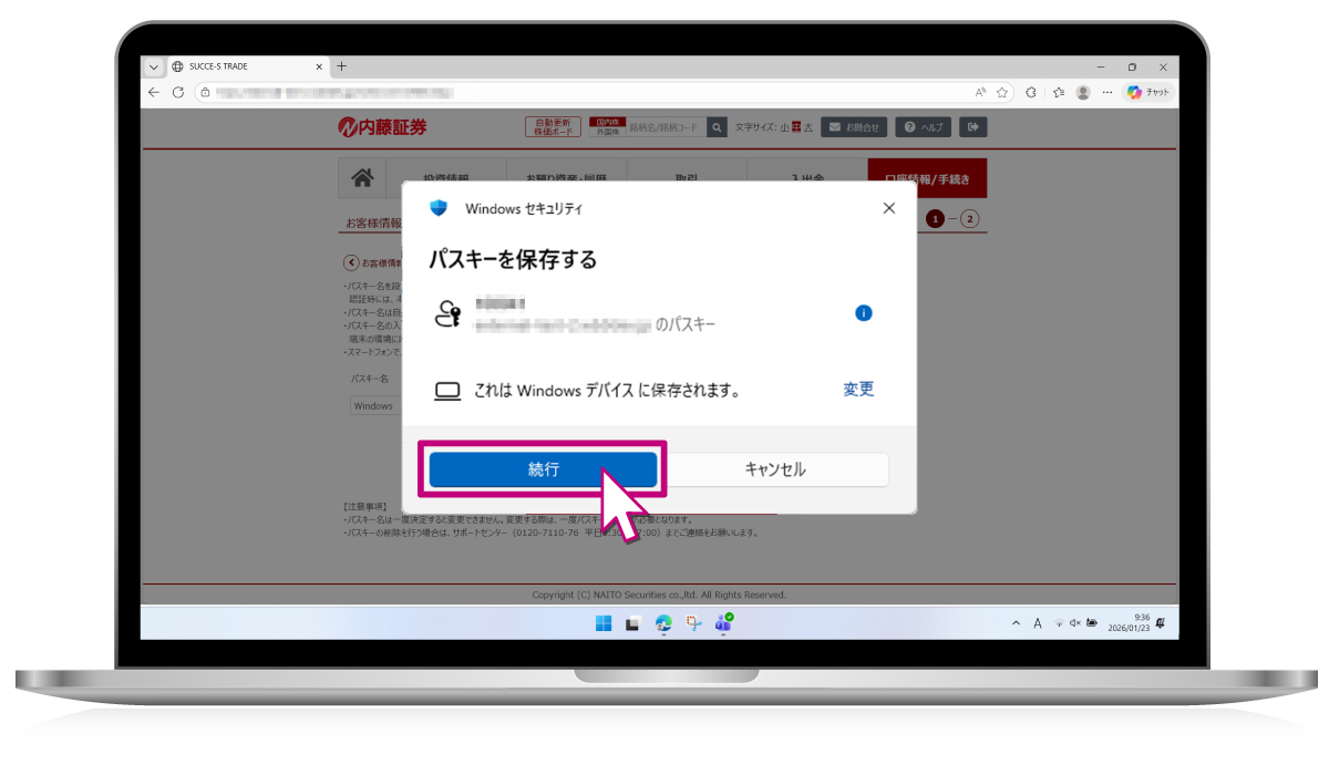 ③「パスキーを保存する」と表示されましたら、「続行」をクリックします。