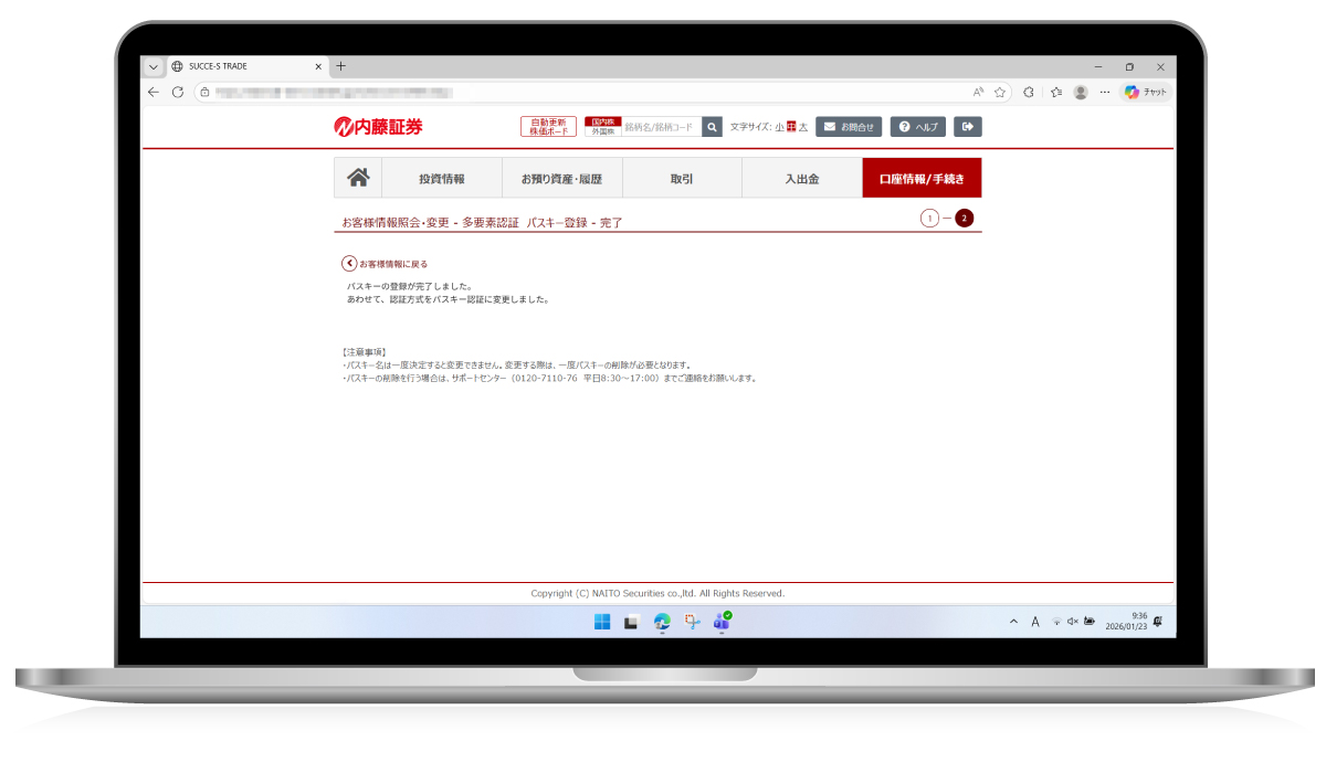 ⑤「お客様情報紹介・変更-多要素認証 パスキー登録-完了画面」が表示されたら、パスキーの登録は完了となります。