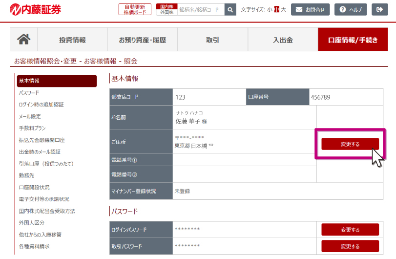 [口座情報/手続き]から[お客様情報照会・変更]を押して[お客様情報 - 照会]画面を開きます。