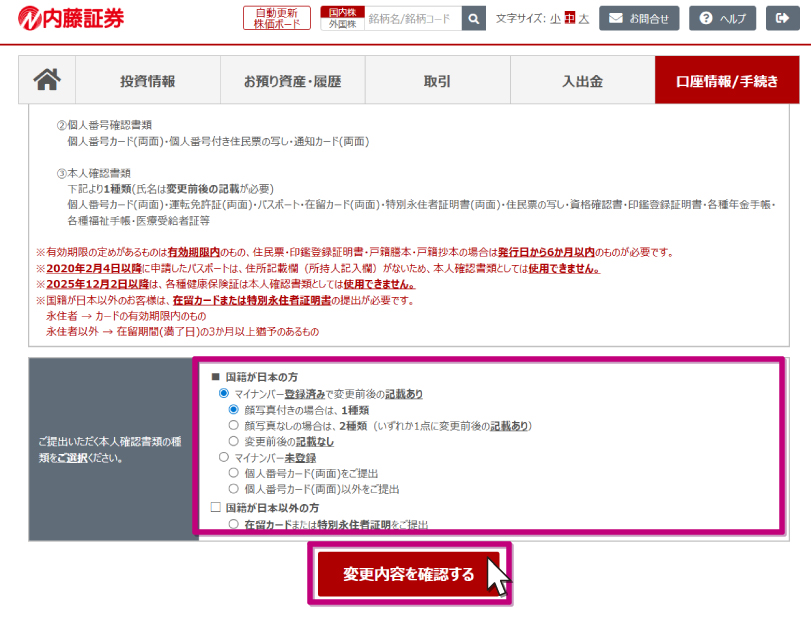 画面下部の本人確認書類の種類を選択し、「変更内容を確認する」ボタンを押します。