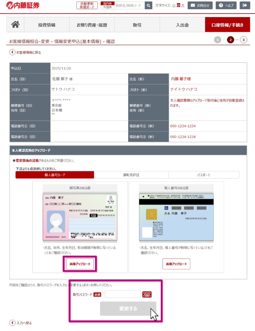 必要な画像を全てアップロードし、取引パスワードを入力のうえ「変更する」を押します。