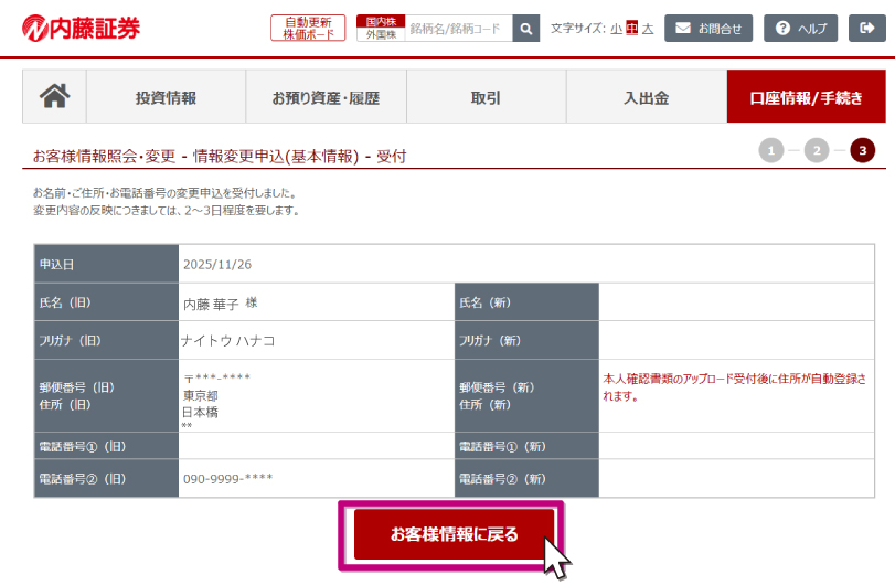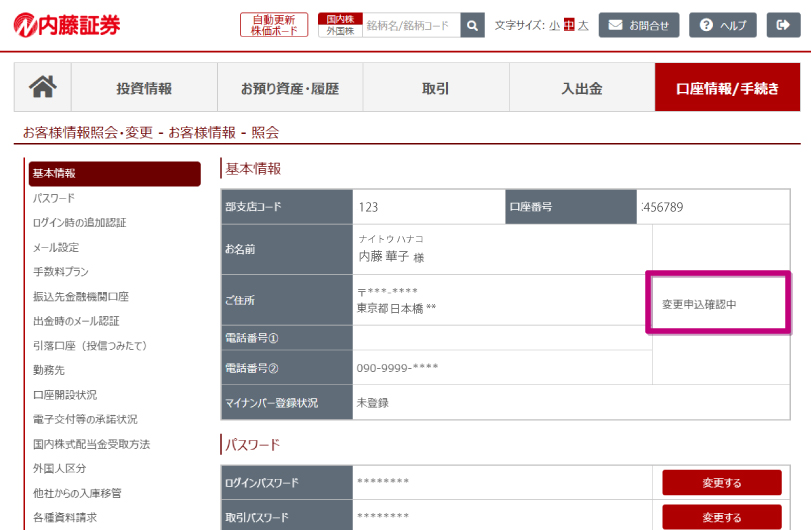 お客様情報画面に戻ると、変更ボタンの代わりに「変更申込確認中」と表示されます。