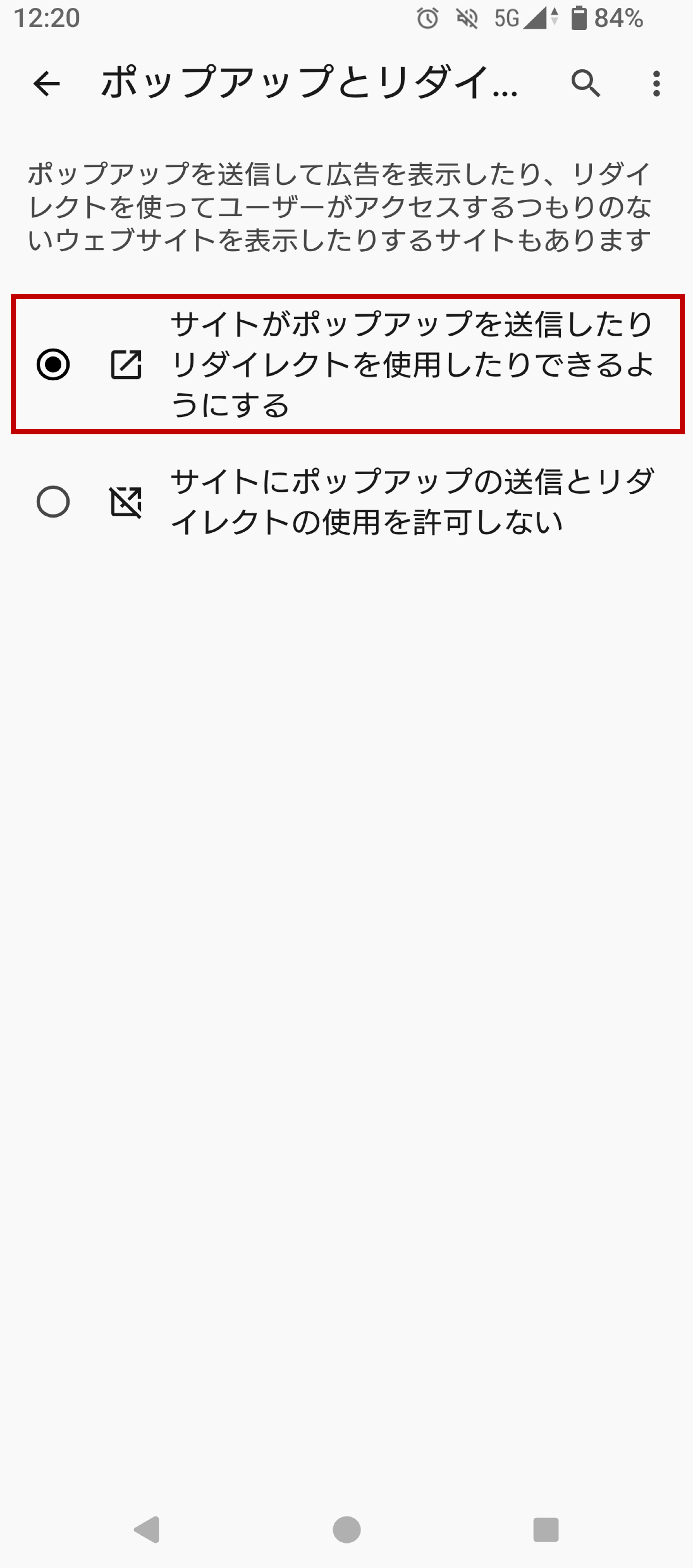 - 「サイトがポップアップを送信したりリダイレクトを使用したりできるようにする」を選択すれば設定完了です。
