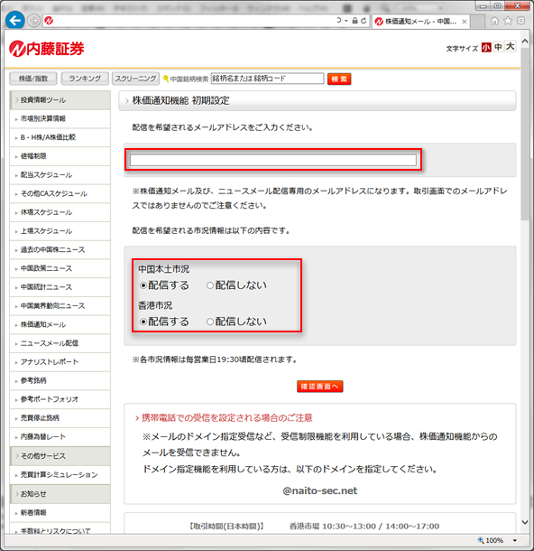 中国本土株市況・香港株市況はニュースメール配信機能からも登録ができます。