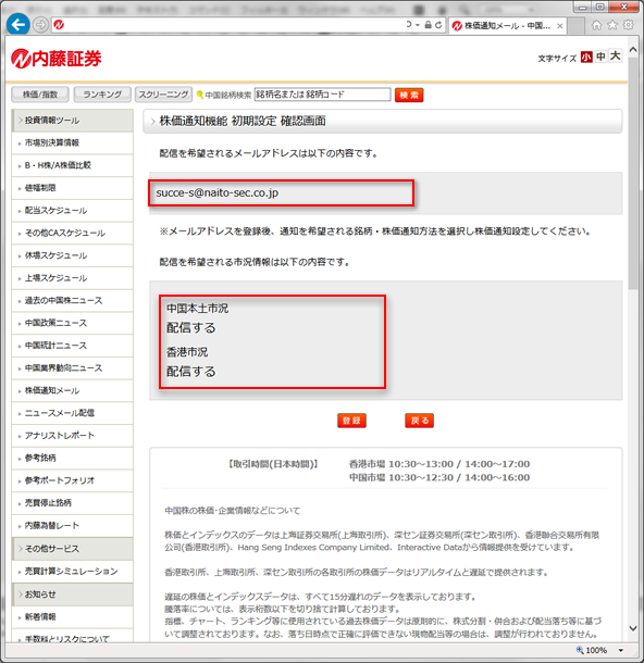 - 同時に、「中国株本土市況」「香港株市況」の情報配信を選択してください。