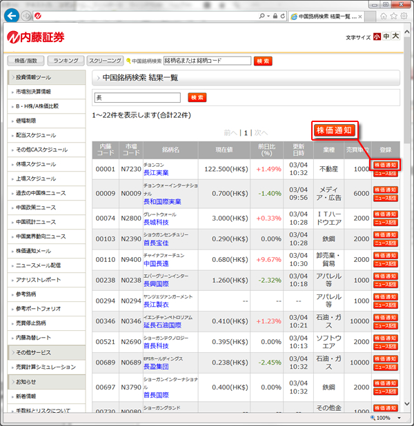 Succe-s trade取引画面にログインし、[投資情報]→[中国株式情報一覧]→[株価通知メール]をクリックします。