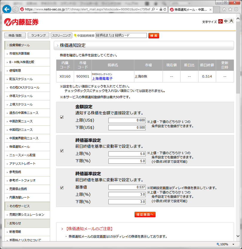 株価通知メールの設定画面は15分ディレイの株価を表示しております。