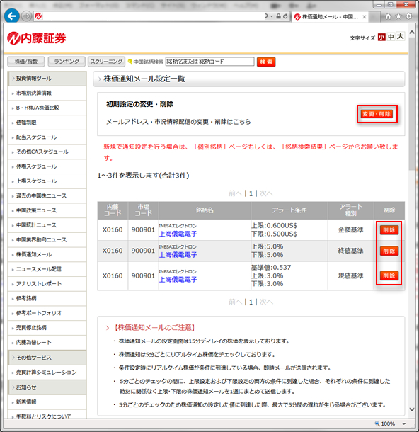 株価通知の設定削除、メールアドレス、市況情報配信設定の変更はこちらの画面から設定いただけます。