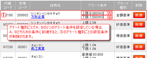 アラート種別ごと(金額設定条件・終値基準設定・現値基準設定)で上値、下値の2アラート条件を設定した場合、設定条件の削除は、どちらかの1つのアラート条件に到達すると、アラート種別ごと(上値・下値セット)の条件が削除されます。