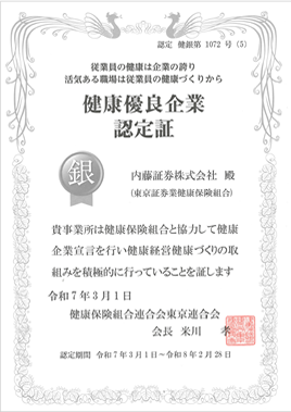 当社は、2018年12月に健康保険組合連合会東京連合会に「健康企業宣言」を行い、2020年2月に『健康優良企業 銀の認定』を取得いたしました。