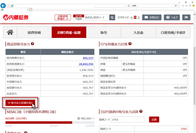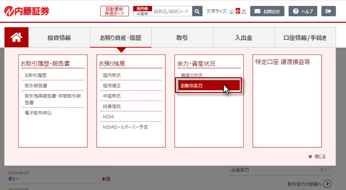 信用取引の新規建余力や保証金預託率などは、取引画面の[お預り資産・履歴]→[余力・資産状況]→[お取引余力]で「商品別取引余力」が確認できます。