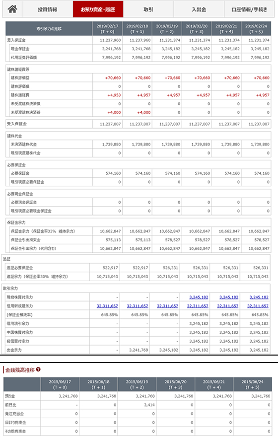 | 保証金預託率 | 「(現金保証金 + 代用証券評価額 - 建株の評価損益合計[最大は0]- 信用取引の諸経費 - 未受渡建株決済損益) ÷ 総建株金額 ×100」で計算します。 | |