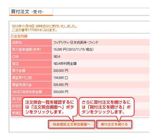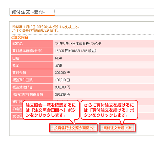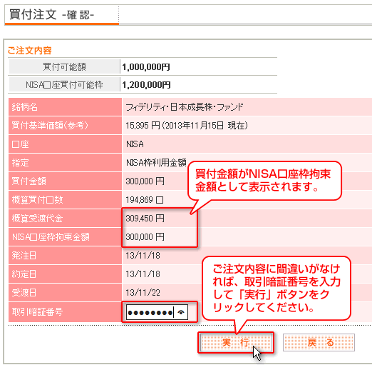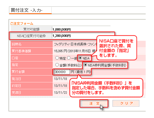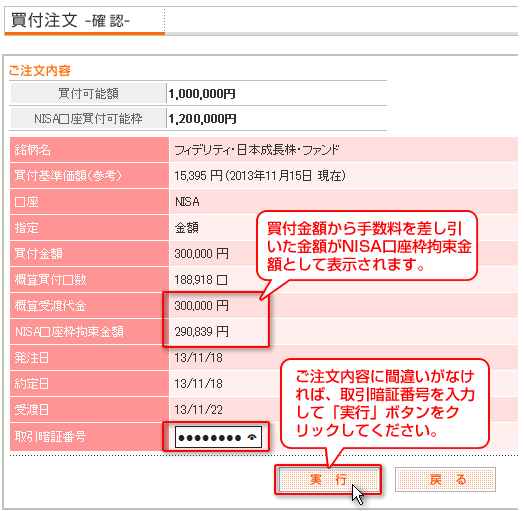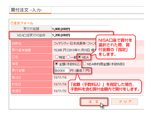 - [口座区分]、[買付金額]、[手数料別]を入力し[注文内容を確認する]をクリックしてください。