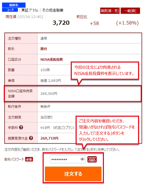 ご注文内容に間違いがないことを確認し、取引パスワードをご入力の上、「注文する」ボタンをクリックしてください。