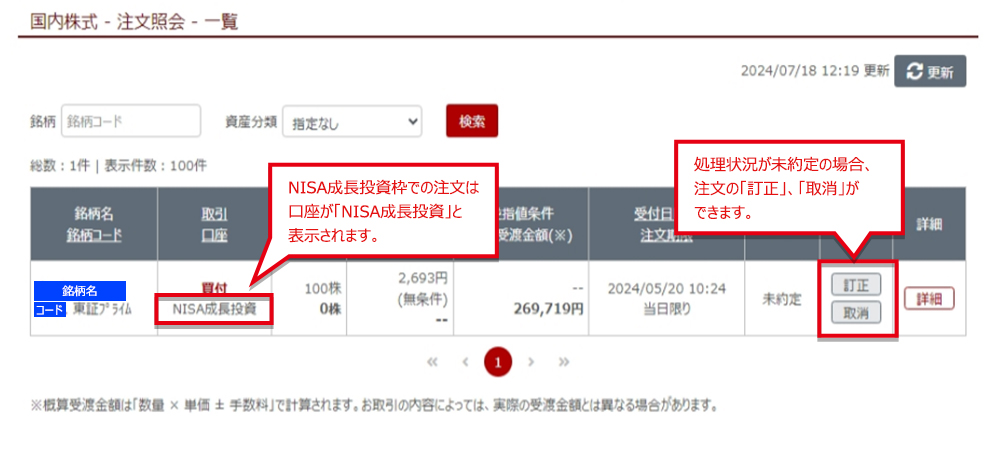 注文を訂正・取消する場合は、「訂正」または「取消」ボタンをクリックしてください。
